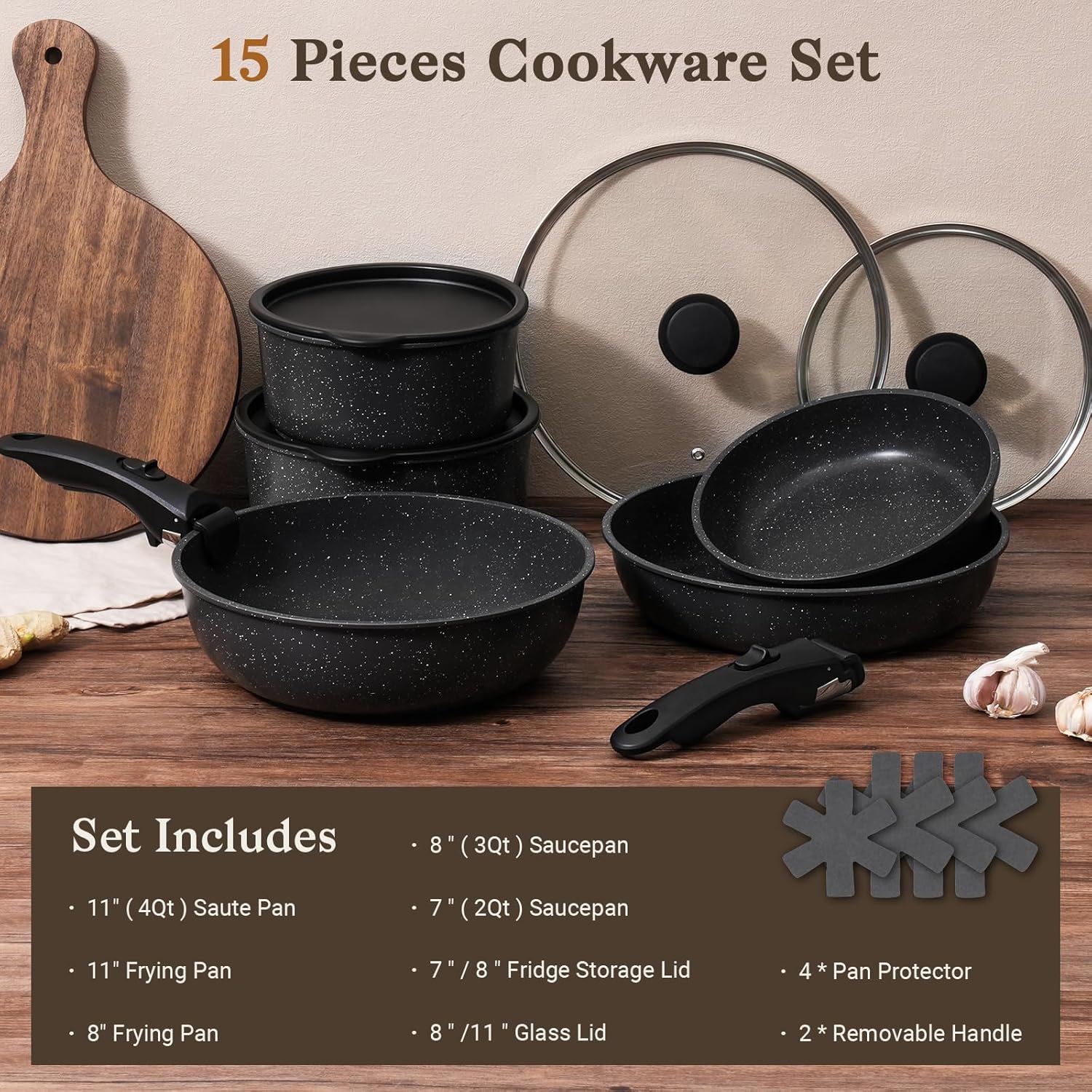 15-Piece Nonstick Cookware Set with Detachable Handles (Black)