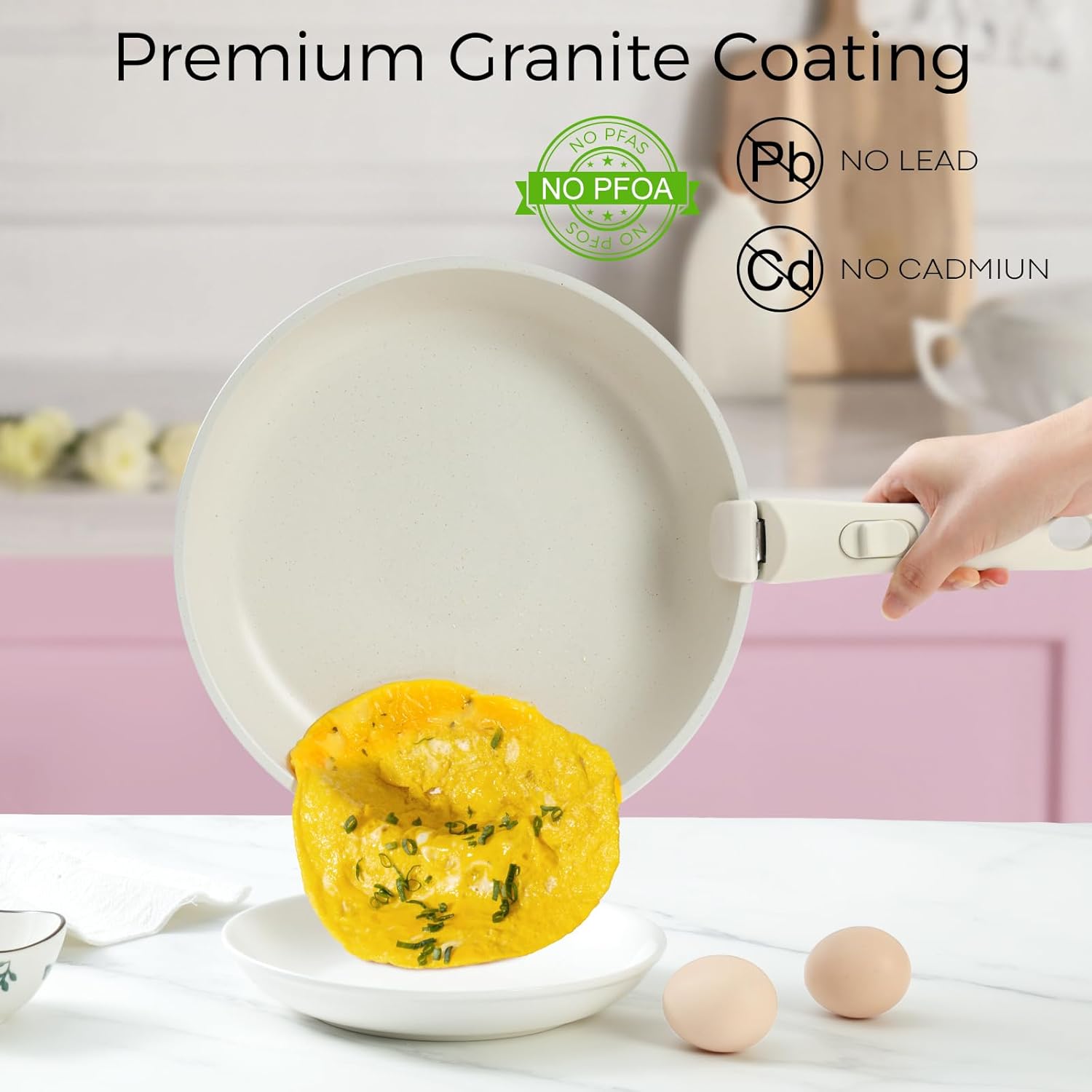 - Space-Saving Design: Pots and pans with detachable handles allow for compact nesting, optimizing 75% kitchen cabinet space and providing a healthy cooking environment,making for easy storage in cabinets or RVs.